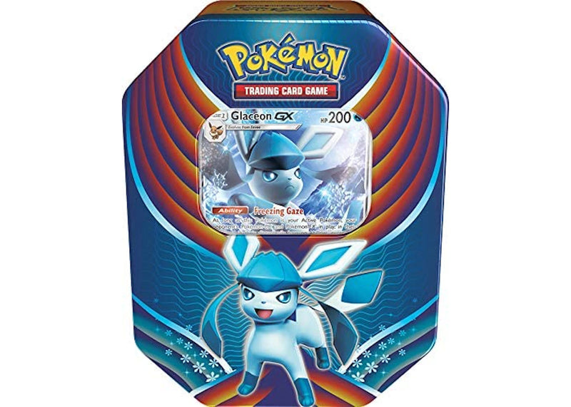 The Pokémon TCG Evolution Celebration Tin pays homage to one of the Pokémon fan-favorite Eeveelutions, Glaceon GX. The tin includes a holo promo card of the snowy Glaceon-GX, a code for the online Pokémon card game, and four Pokémon TCG booster packs.