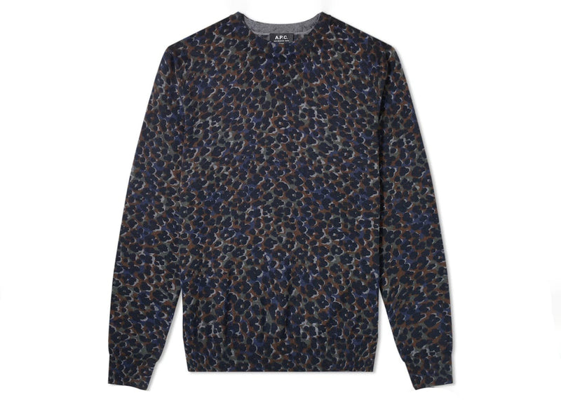 The A.P.C. Pull Fauve Crewneck Blue Leopard Print is now available at Side Kicks!