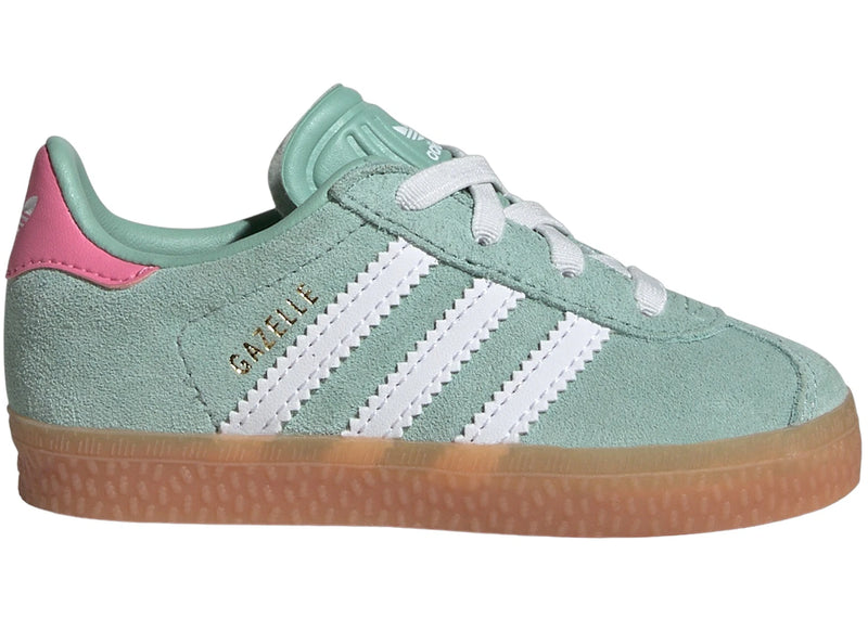 The adidas Gazelle Comfort Closure Hazy Green Cloud White Bliss Pink (TD) is now available at Side Kicks!