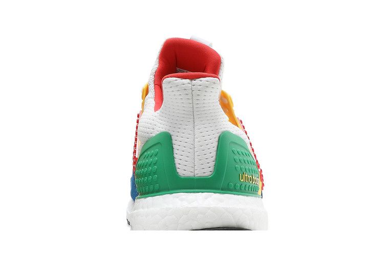 The adidas Ultra Boost DNA Lego Multi features a Primeknit upper with a Cloud White base, Shock Blue toe overlays, and a Green heel counter. It includes adidas x Lego branding on the tongue tag and insole, with Lego-inspired red and yellow accents. The lace cage showcases Yellow and Red 3-Stripes, while the lateral heel retains traditional Ultra Boost branding. A White Boost midsole sits atop a Black rubber outsole.
