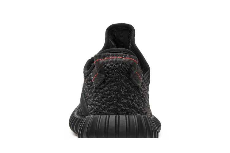 The adidas Yeezy Boost 350 Pirate Black 2015 features a Pirate Black and dark gray speckled Primeknit upper with suede medial accents and red heel tabs. It includes dark gray...