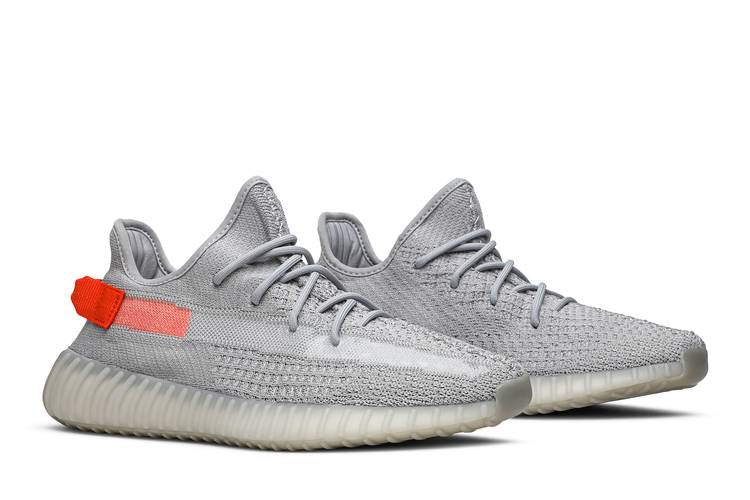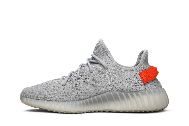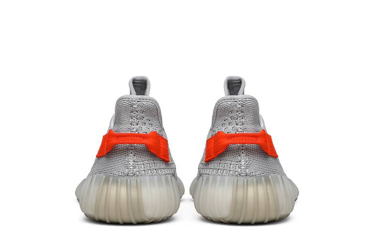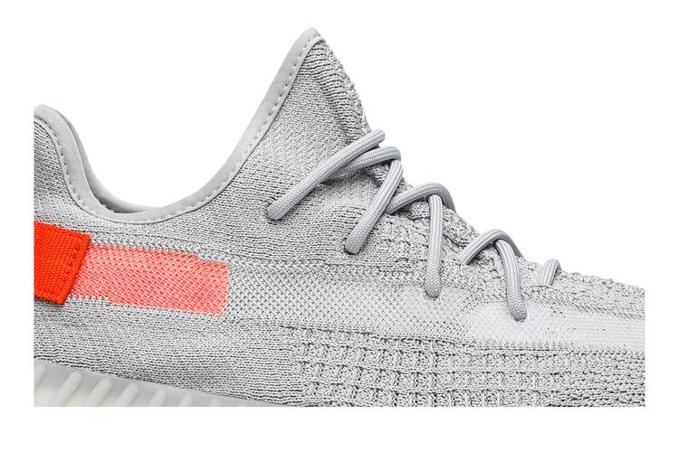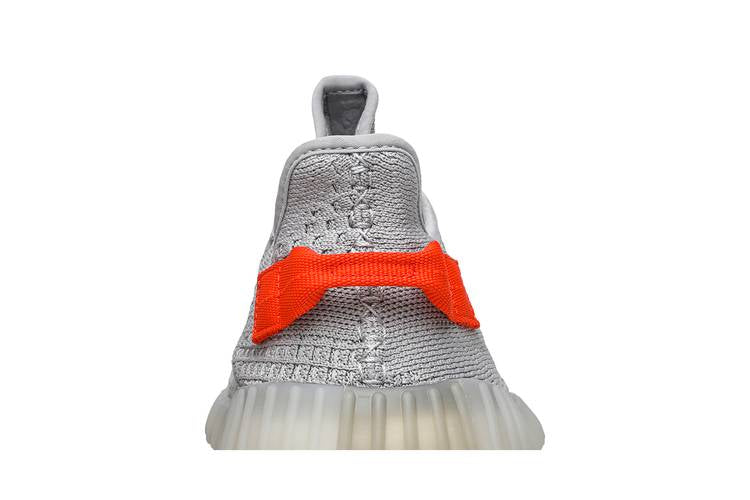 The adidas Yeezy Boost 350 V2 Tail Light features a bright orange heel tab and a subtle orange side stripe on a light grey Primeknit upper. The shoe includes a...