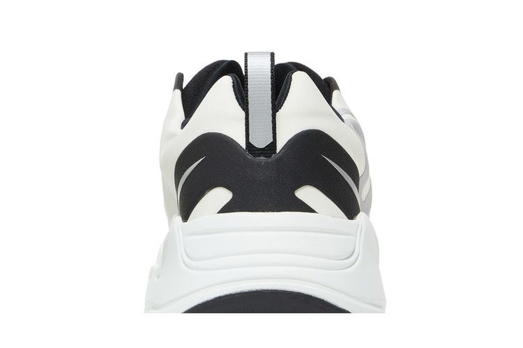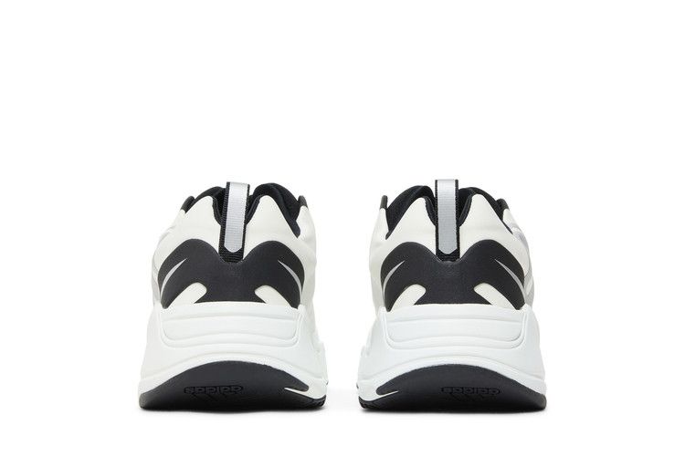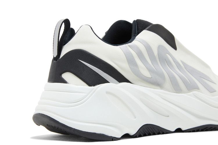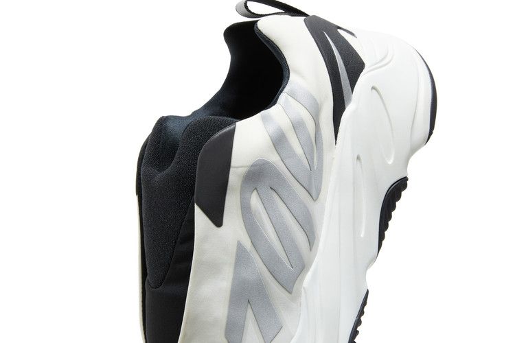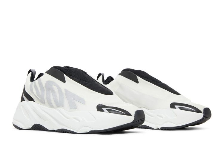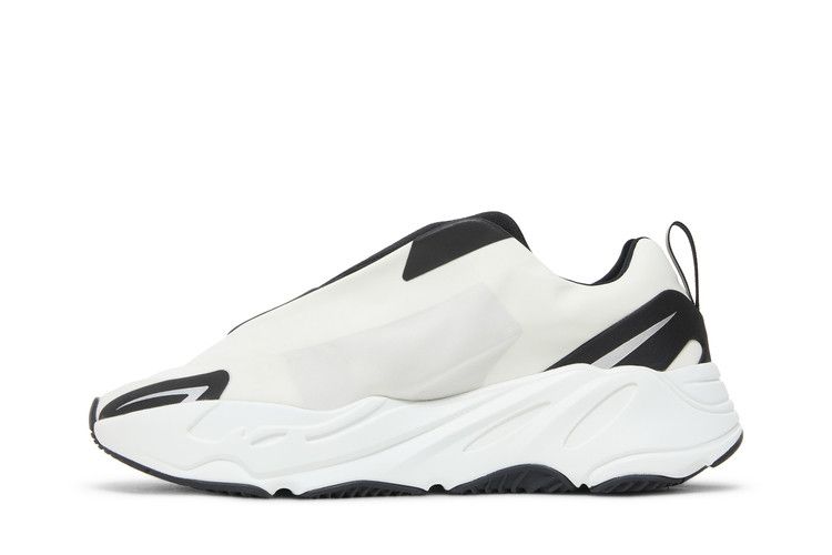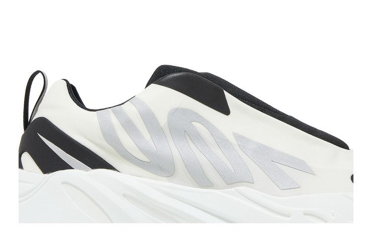 The adidas Yeezy Boost 700 MNVN Laceless Analog features a synthetic upper in off-white with dark overlays and a black tongue. Reflective metallic silver "700" branding appears on the heel...