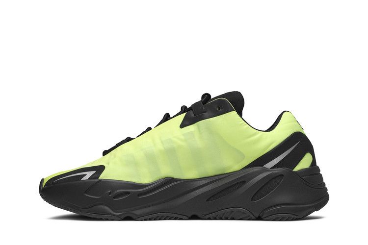 The adidas Yeezy Boost 700 MNVN Phosphor features a neon yellow mesh upper with black pull tabs and toe. The laceless design includes a black sock liner, tongue, and overlay...