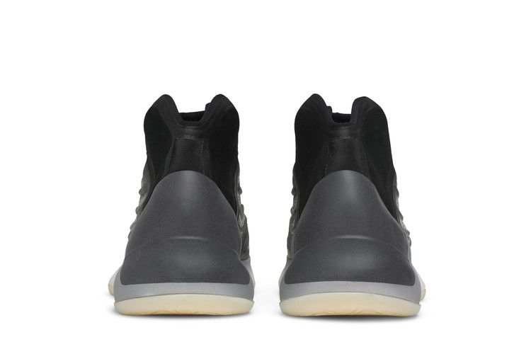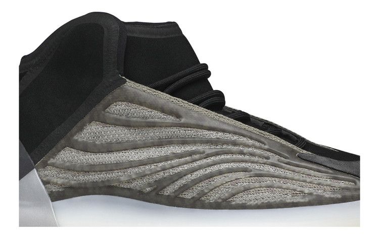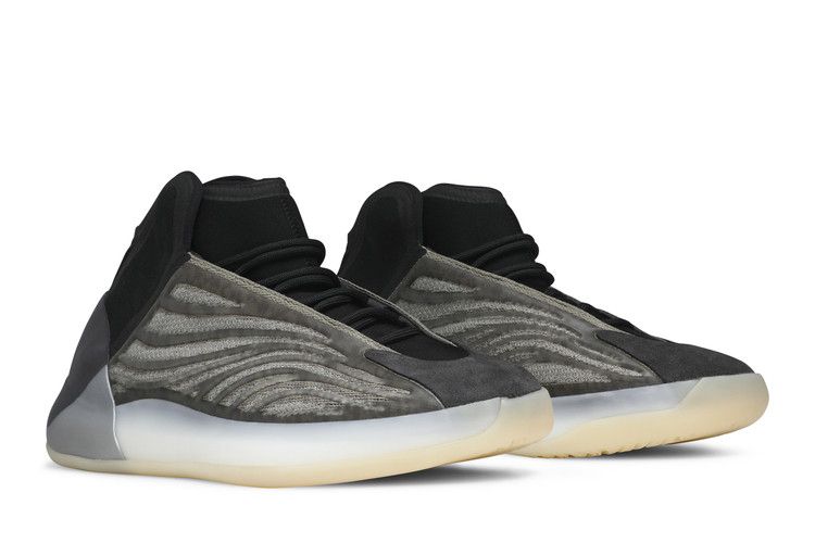 The Yeezy QNTM Barium features a dark grey Primeknit upper with suede overlays and reflective detailing. It includes a translucent sole, extended ankle collar, and reinforced heel cap for added...
