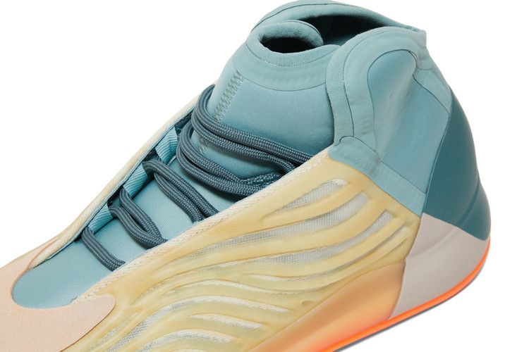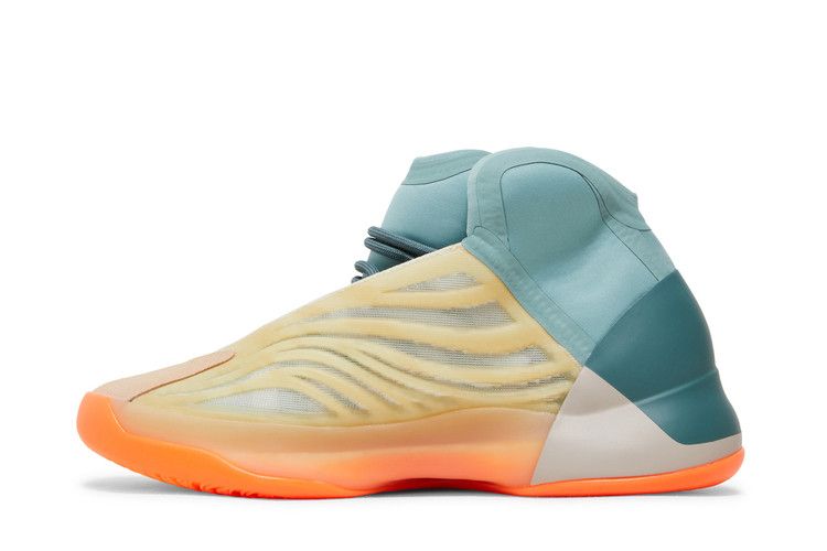 The adidas Yeezy QNTM Hi-Res Coral features a basketball-inspired silhouette with a vibrant yellow RPU cage layered over a semi-translucent jacquard mesh upper. Beige synthetic suede reinforces the toe, while...