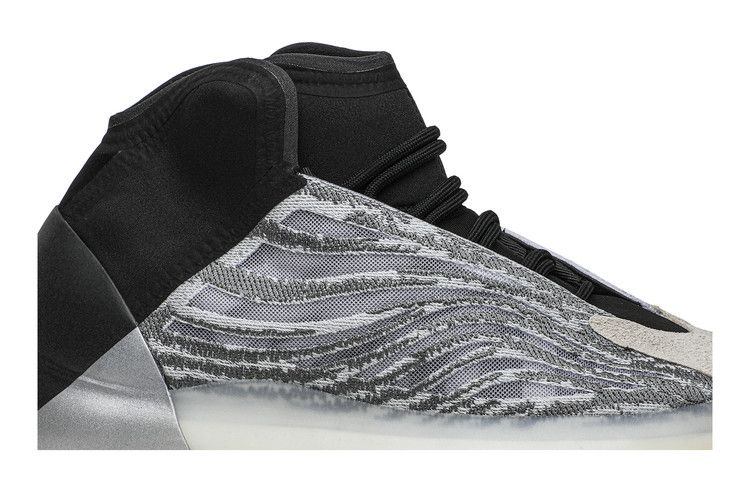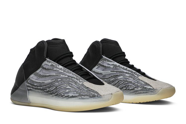 The adidas Yeezy QNTM BSKTBL features a grey Primeknit upper with suede overlays and reflective detailing. It includes a translucent sole, extended ankle collar, and reinforced heel cap for basketball performance. Released on Spring 2020, the adidas Yeezy QNTM BSKTBL is available now at Side Kicks.