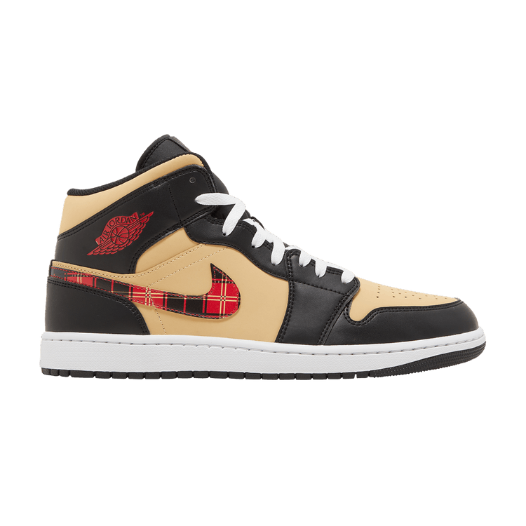 The Air Jordan 1 Mid Tartan Swoosh features a leather upper in sesame, fire red, and white with black overlays. Tartan Swooshes, tongue tag, and insole add contrast, while the Wings logo appears on the collar in fire red. The design includes a perforated toe box, Jumpman branding on the tongue, and a black midsole with a white rubber outsole for traction. Released on November 10, 2022, the Air Jordan 1 Mid Tartan Swoosh is available now at Side Kicks.