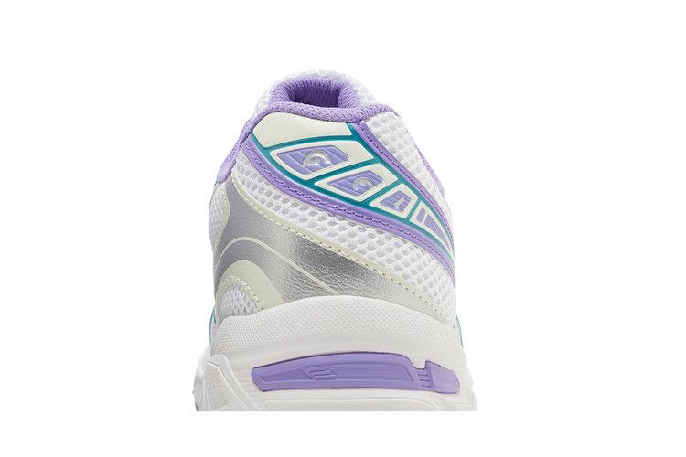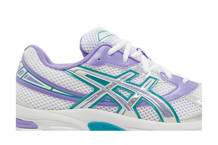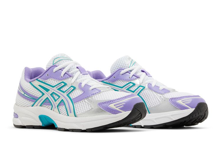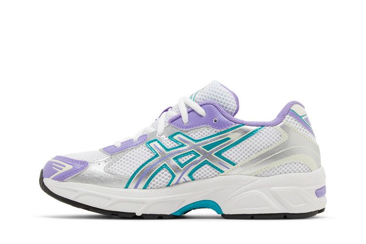 The ASICS Gel-1130 Space Lavender (GS) features contrasting Space Lavender and teal overlays on a white base, inspired by late 1990s aesthetics. The design draws from 2008 stability running shoes...