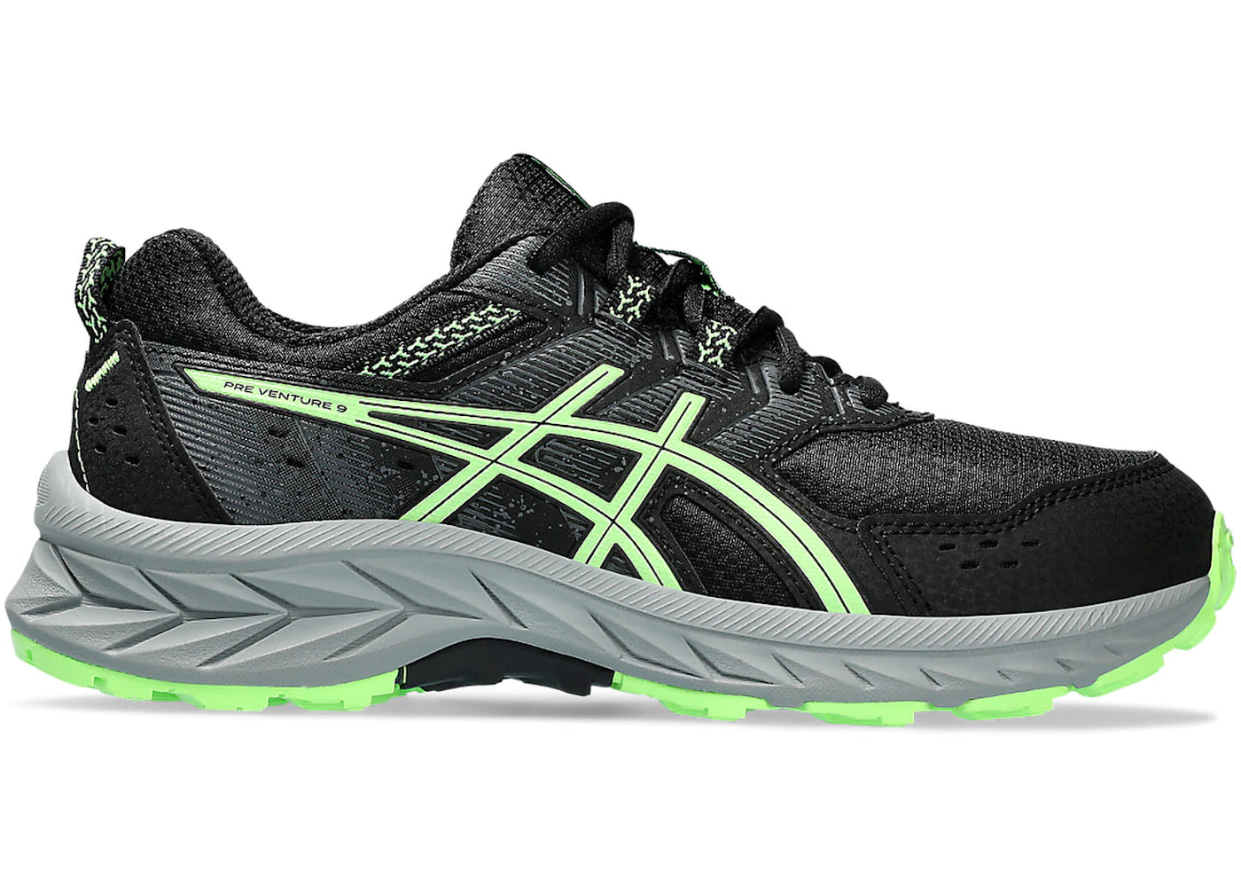The ASICS Gel-Venture 9 Black Illuminate Green (GS) is now available at Side Kicks!