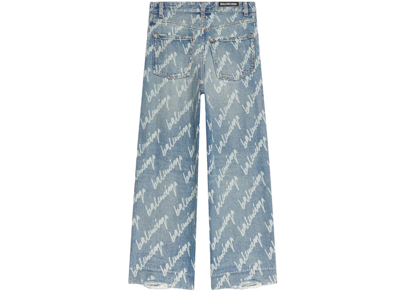 The Balenciaga Womens All Over Logo Cropped Denim Trousers Indigo/White is now available at Side Kicks!