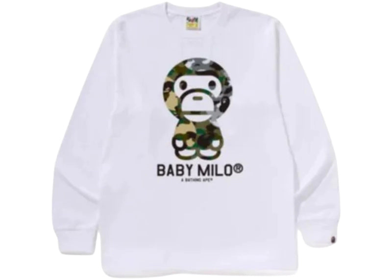 The BAPE 1st Camo Crazy Baby Milo L/S Tee Tee White is now available at Side Kicks!
