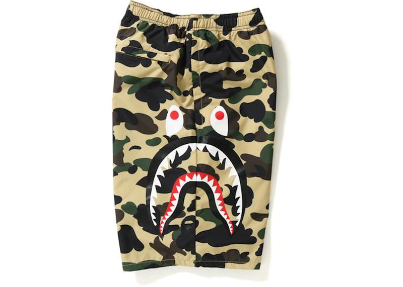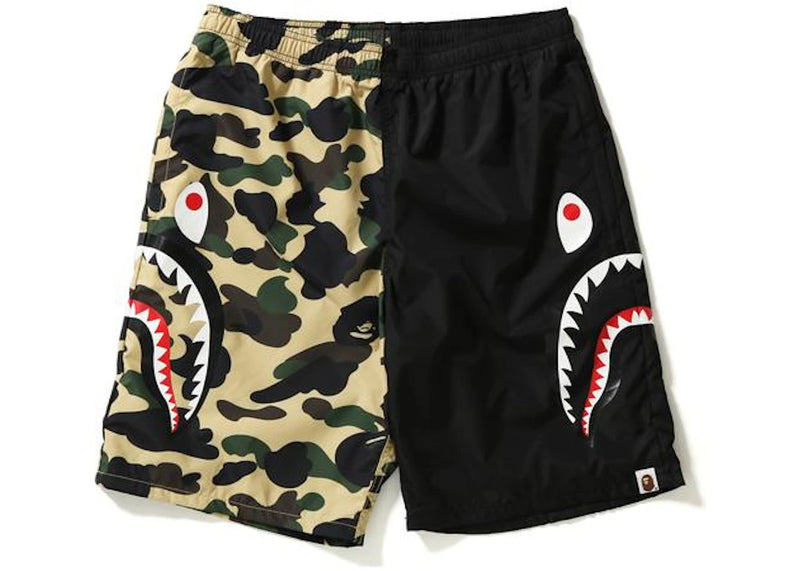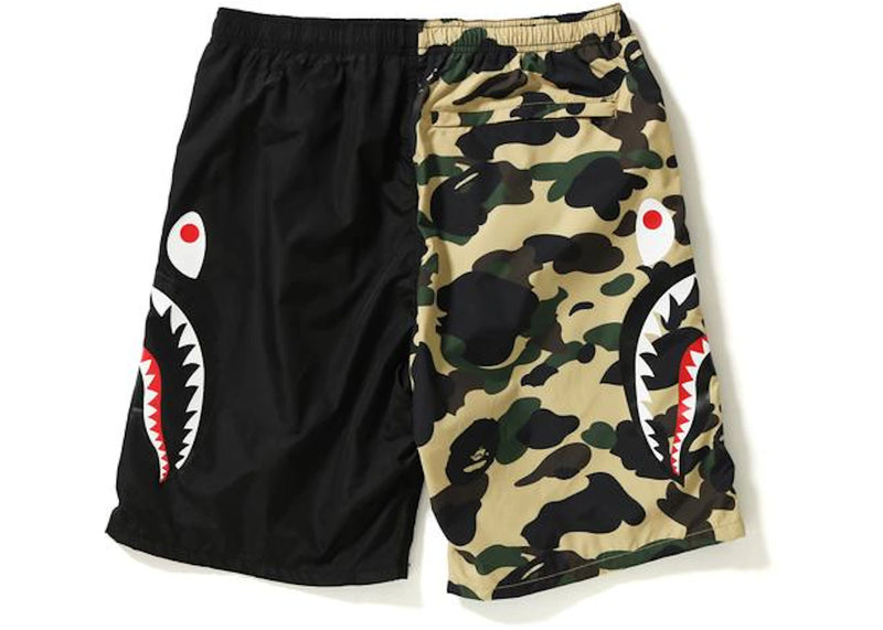 The BAPE 1st Camo Half Shark Beach Shorts Black/Yellow is now available at Side Kicks!