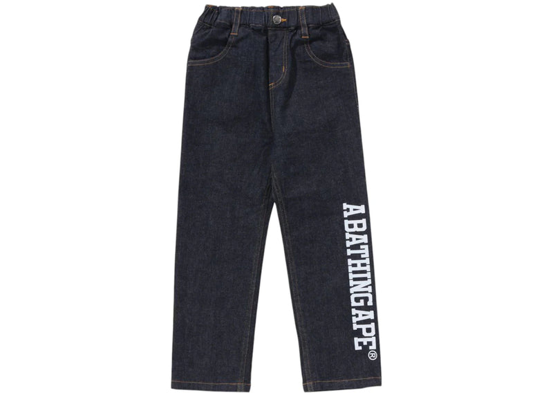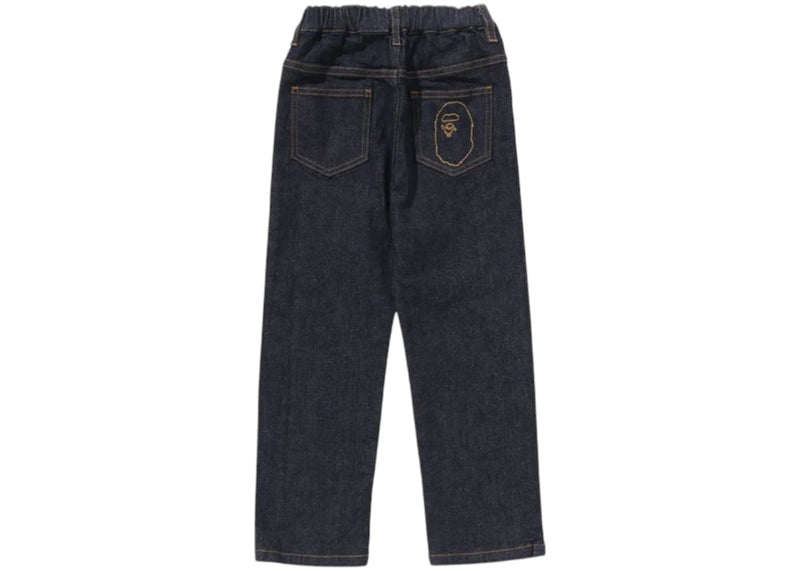 The BAPE Kids 10oz Stretch Denim Tapered Pants Navy is now available at Side Kicks!
