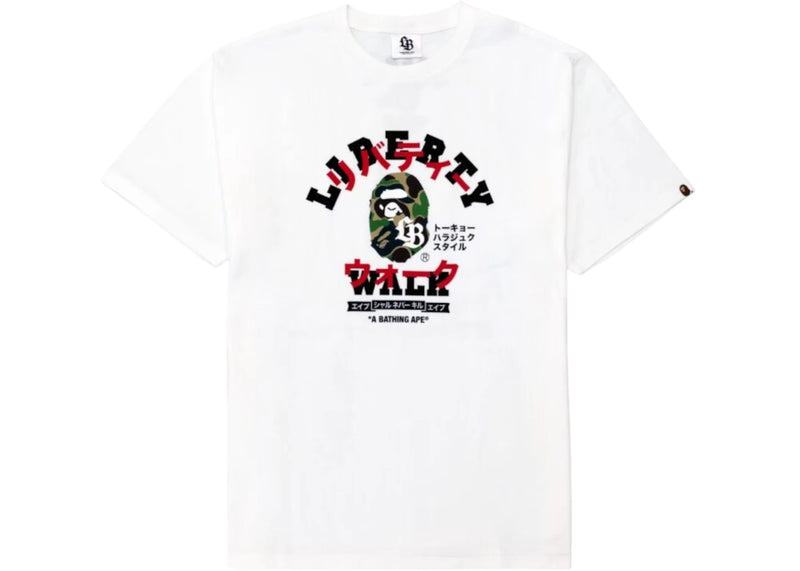The BAPE x LBWK Katakana College Tee White is now available at Side Kicks!