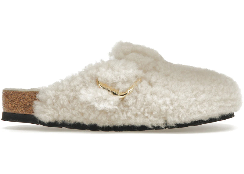 The Birkenstock Boston Big Buckle Shearling Egg Shell is now available at Side Kicks!