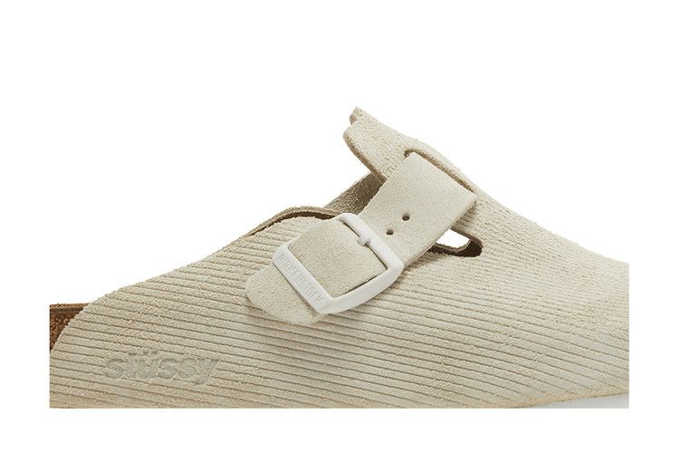 The Birkenstock Boston Clogs Stussy Bone features a bone-colored suede upper with a debossed corduroy texture. The midfoot strap fastens with a tonal buckle, while debossed Stussy and Birkenstock branding appears on each side.