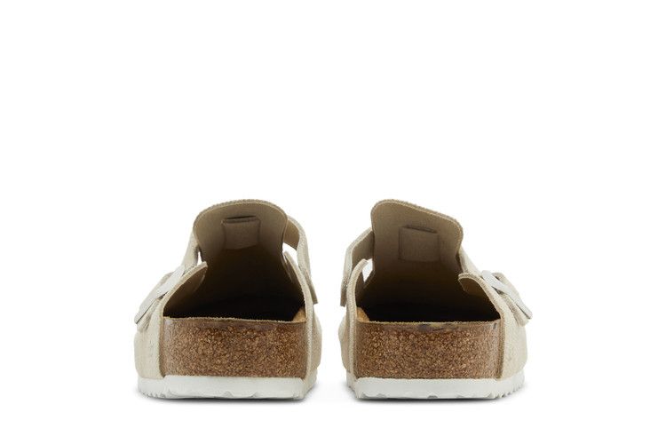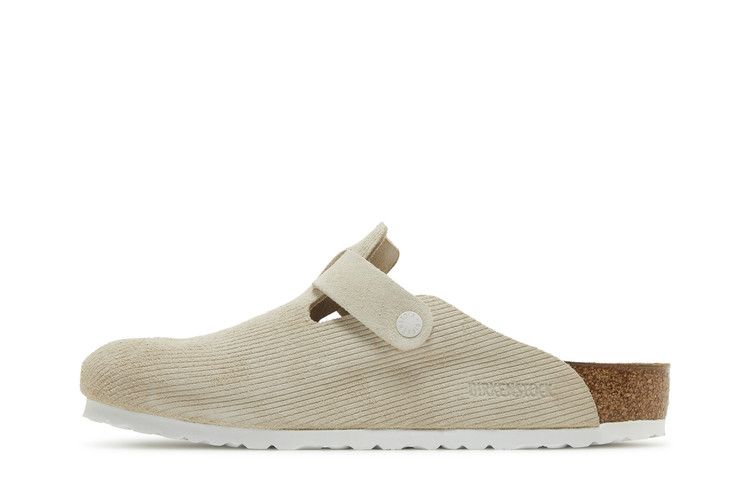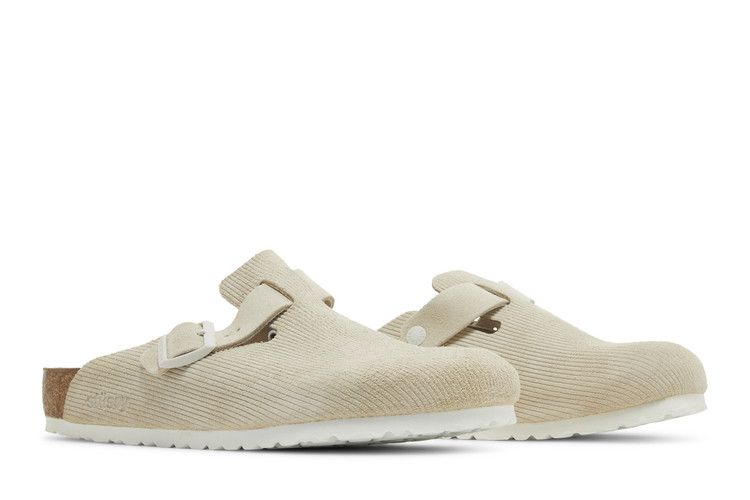 The Birkenstock Boston Clogs Stussy Bone features a bone-colored suede upper with a debossed corduroy texture. The midfoot strap fastens with a tonal buckle, while debossed Stussy and Birkenstock branding...