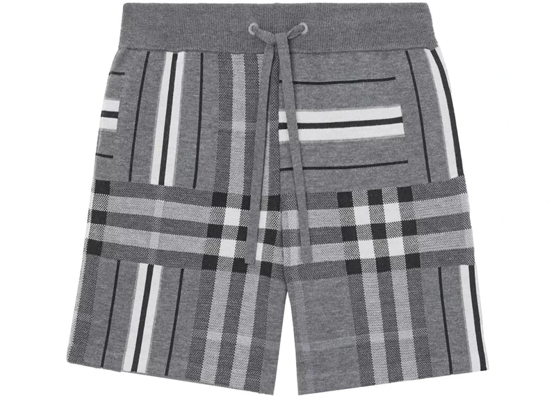 The Burberry Check And Stripe Wool Blend Jacquard Shorts Dark Grey Melange is now available at Side Kicks!