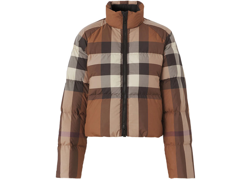 The Burberry Women's Check Cropped Puffer Jacket Dark Birch Brown is now available at Side Kicks!