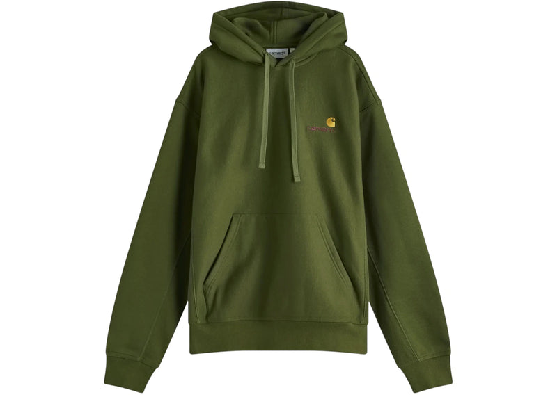 The Carhartt WIP Hooded American Script Sweatshirt Tarragon is now available at Side Kicks!