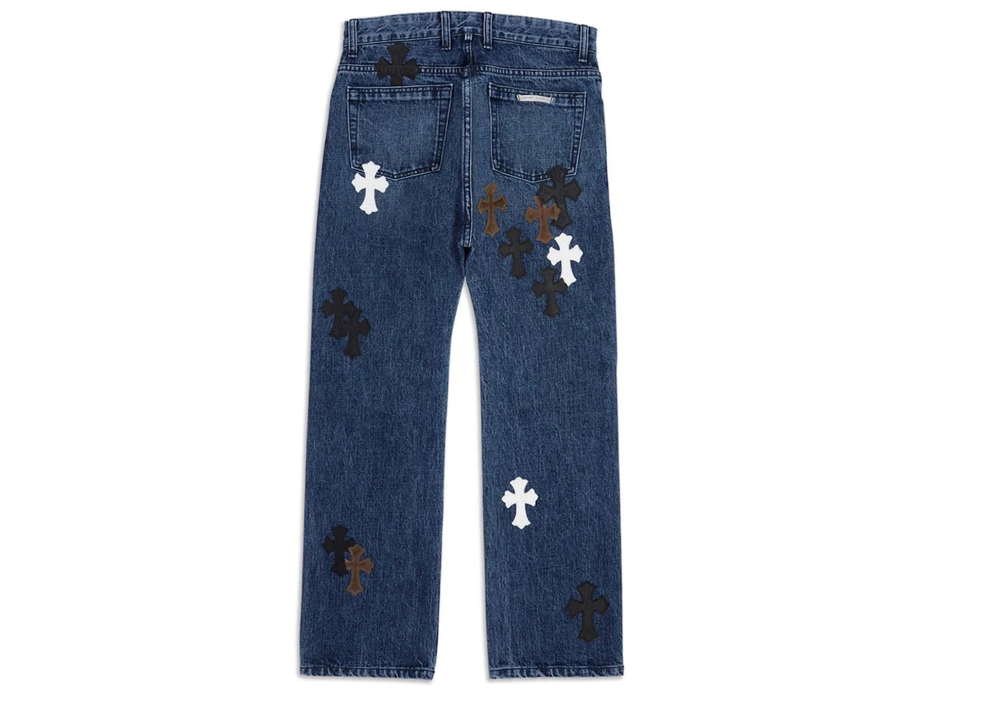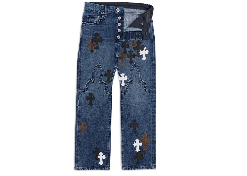 The Chrome Hearts Fleur Knee Cross Patch Jeans Blue is now available at Side Kicks!