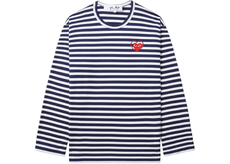 The Comme des Garcons PLAY Metalstone Heart Striped L/S Tee Navy is now available at Side Kicks!