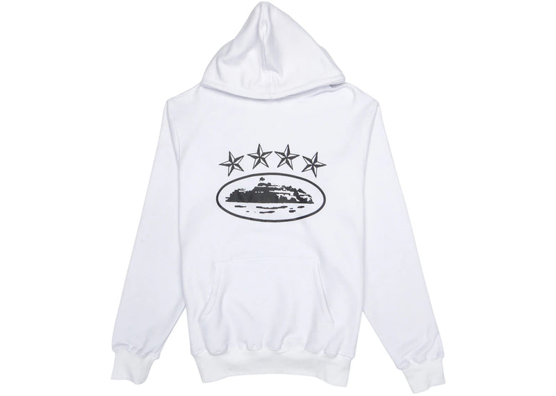 The Corteiz 4Starz Alcatraz Hoodie Black is crafted from 100% breathable cotton with a kangaroo pocket. It includes a screen-printed chest graphic featuring the brand logo and an oval cloud design. The fleece-lined hoodie has an adjustable drawstring hood and comes in black, white, and grey. Released on March 2022, the Corteiz 4Starz Alcatraz Hoodie Black is available now at Side Kicks.