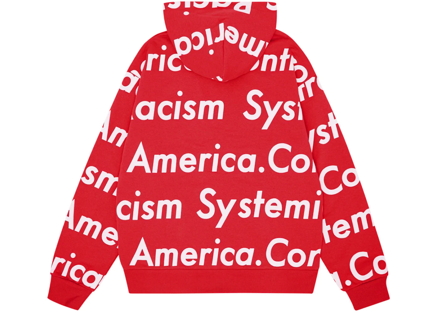 The Denim Tears x Arthur Jafa Systemic Racism Controls America Zip Up Hoodie Red is now available at Side Kicks!