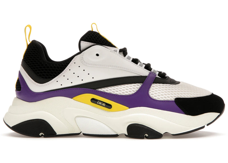 The Dior B22 Violet White features a chunky silhouette with a vibrant mix of white, violet, and yellow. Constructed from mesh and leather, it balances durability with a futuristic design. The color contrast creates a bold yet sophisticated look, ideal for fashion-forward wearers.
