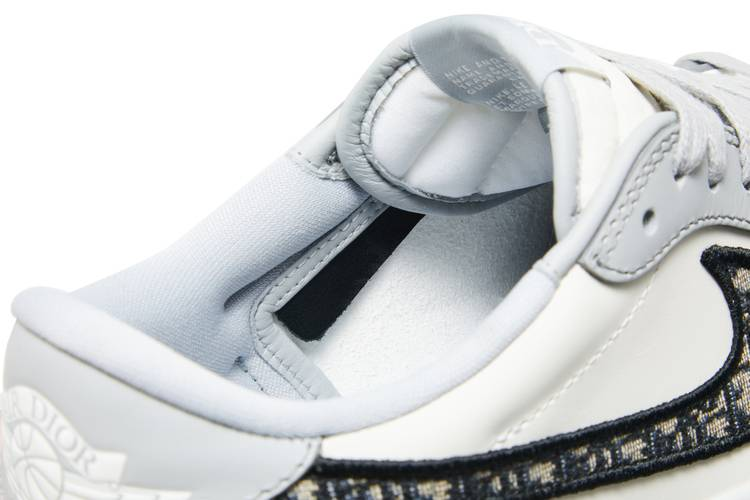 The Dior x Air Jordan 1 Low combines the iconic design of the Air Jordan 1 with the luxury aesthetic of Dior. Crafted from premium Italian leather, the sneakers feature a clean white base with grey accents. Key design elements include a Dior Air tongue tag, Dior Oblique Swoosh, and Dior Wings logo on the heel tab. Made in Italy, the shoes are completed with translucent outsoles showcasing hidden branding details.