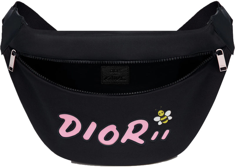 The Dior x Kaws Belt Bag Pink Logo Nylon Black is now available at Side Kicks!