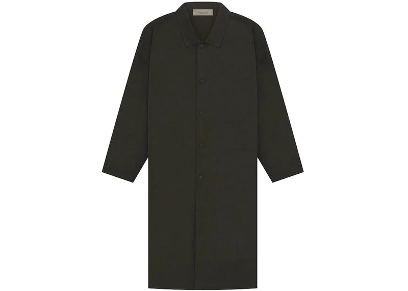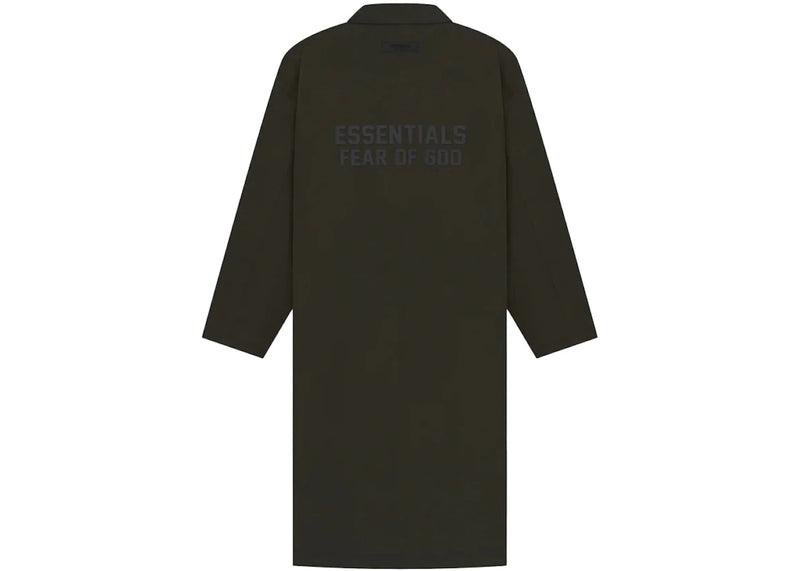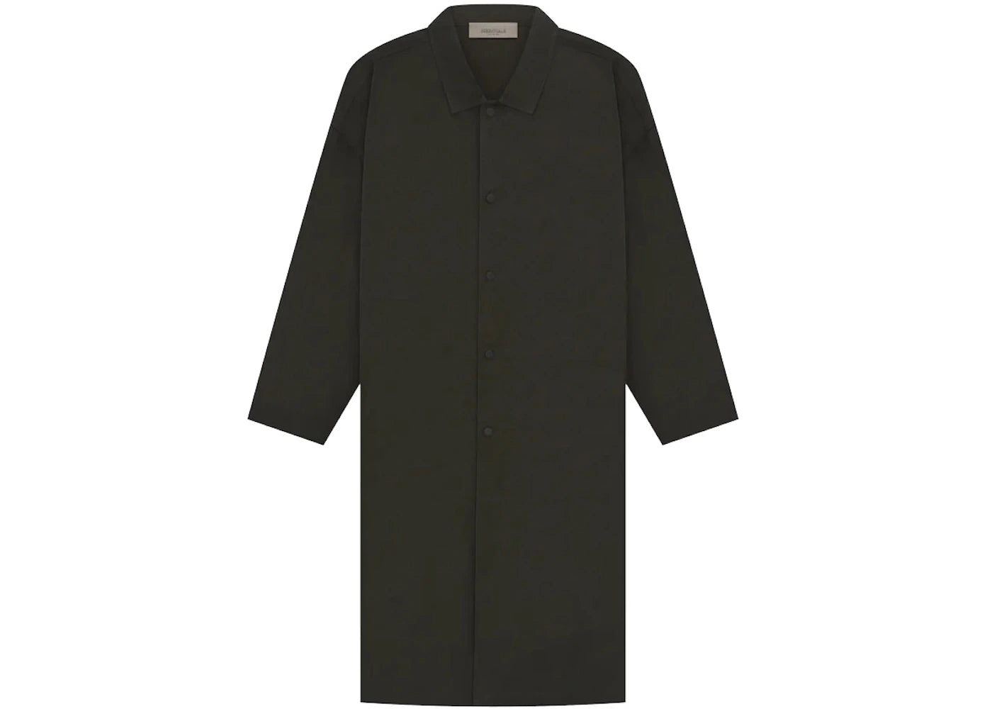 The long coat features a soft cotton blend fabric, designed as the outermost layering piece. It includes a modern rubberized Fear of God logo on the back, a snap button placket, side seam pockets, and a point collar. A rubberized Essentials label is stitched at the back collar. Released on {date}, the long coat is available now at Side Kicks.