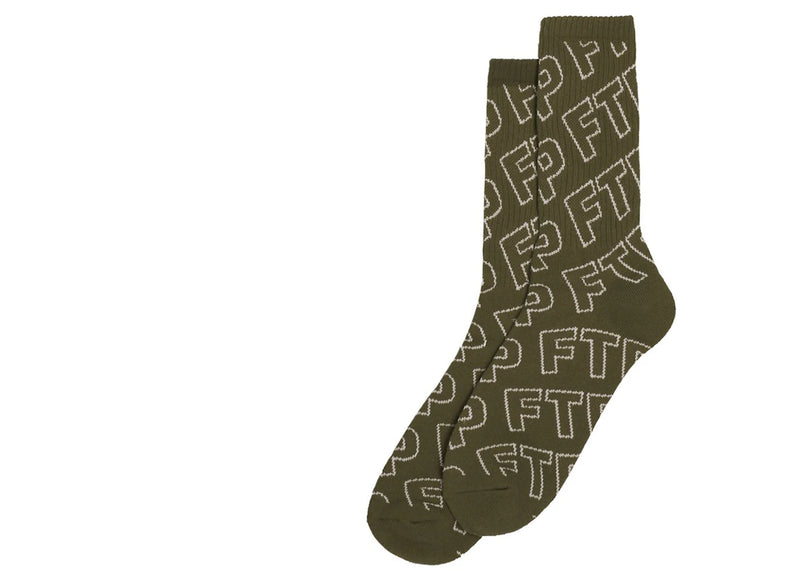 The FTP All Over Outline Logo Socks Olive is now available at Side Kicks!