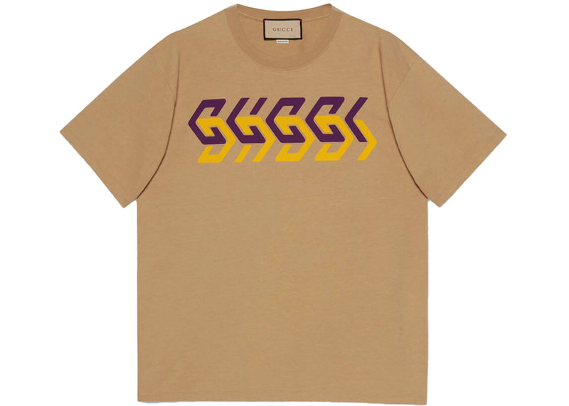 The Gucci Mirror Logo-Print T-Shirt Camel/Purple/Yellow is now available at Side Kicks!