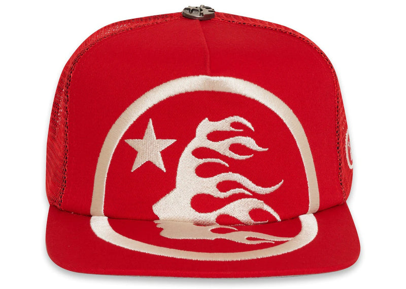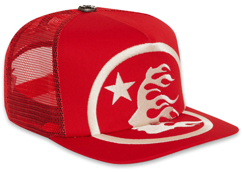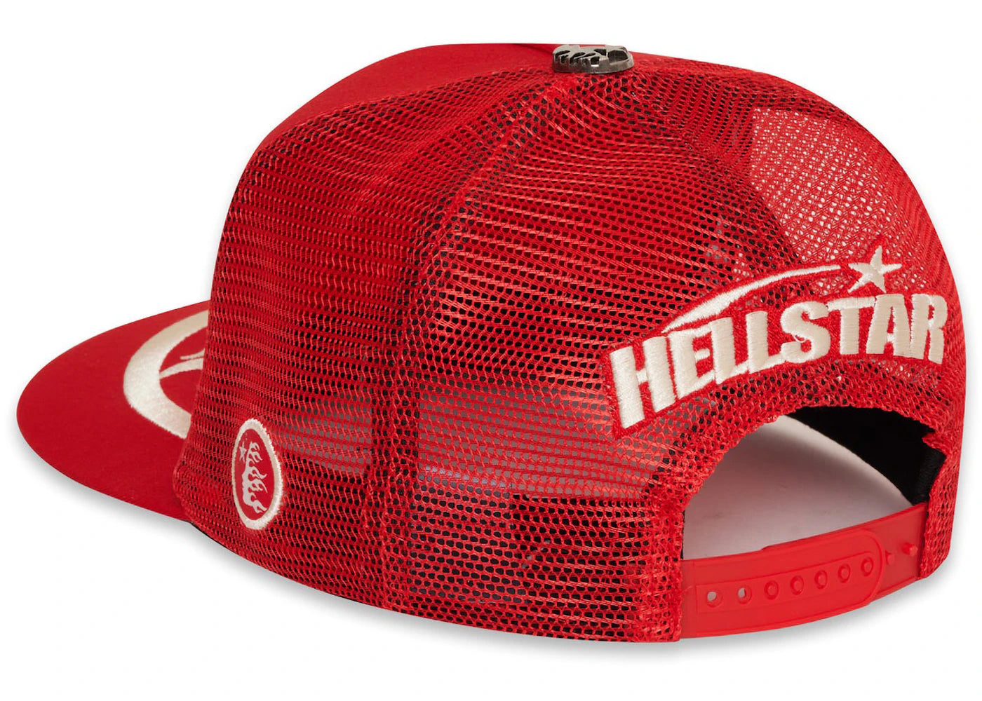The Hellstar Big Logo Trucker Snapback Hat Red is now available at Side Kicks!