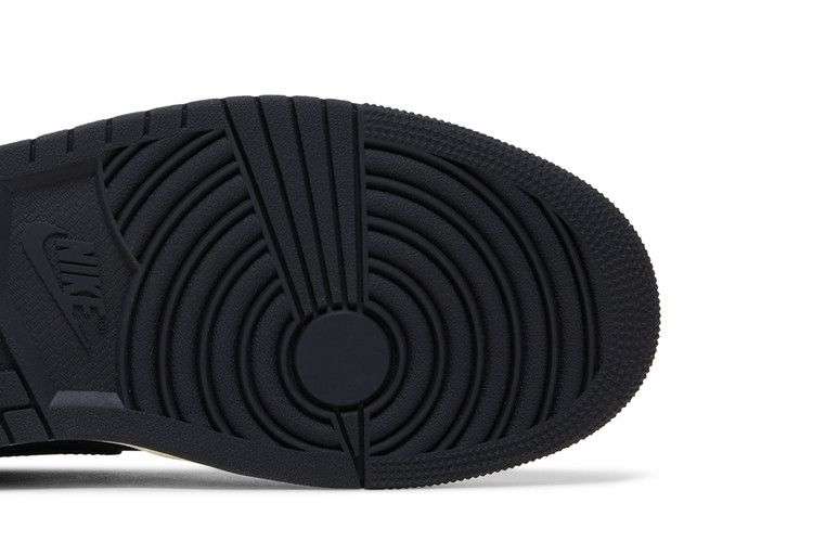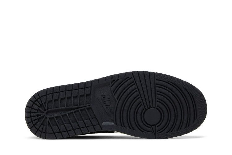 The Air Jordan 1 Low Beaded Swoosh features a mix of leather, satin, and suede panels with diamond patterns. It comes in a black and gray colorway with gold accents, highlighted by an iridescent beaded Swoosh. The design includes a sail midsole, gold stitching, and a black rubber outsole. Released on January 2022, the Air Jordan 1 Low Beaded Swoosh is available now at Side Kicks.