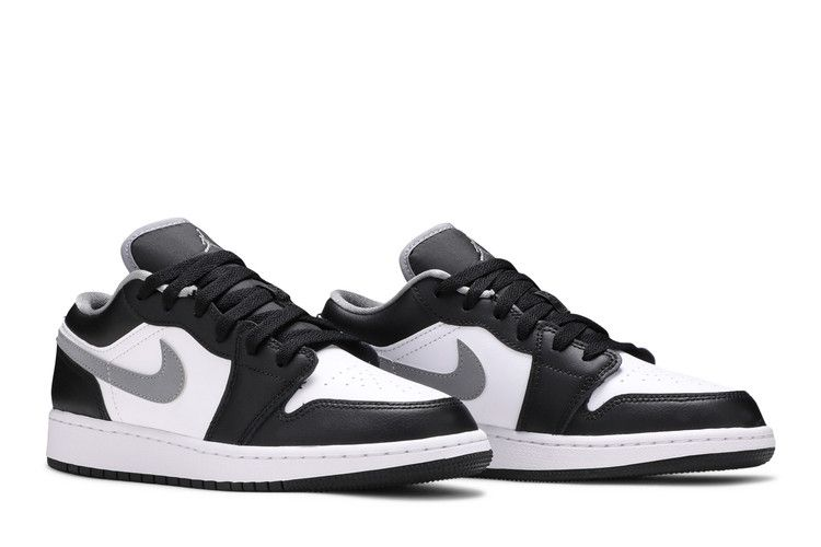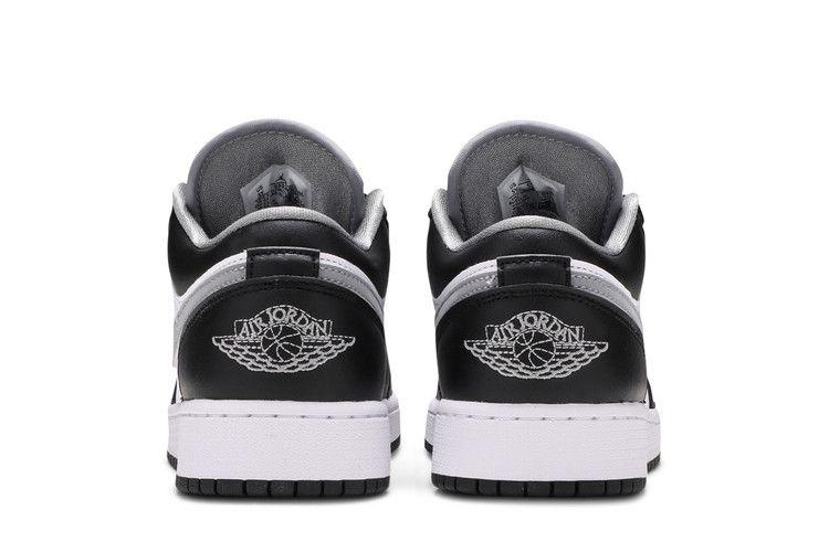 The Air Jordan 1 Low Black White Grey (GS) features a white leather base with black overlays and a grey Swoosh. It has a black cushioned tongue with grey Jumpman logo and a Wings emblem on the heel. Released in July 2021.
