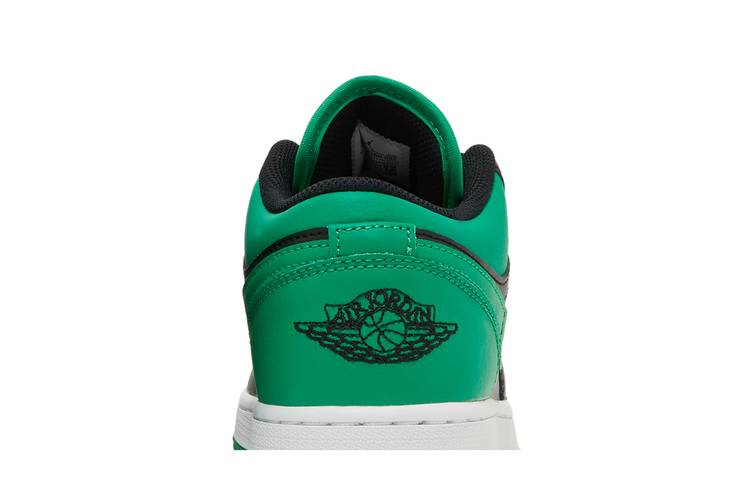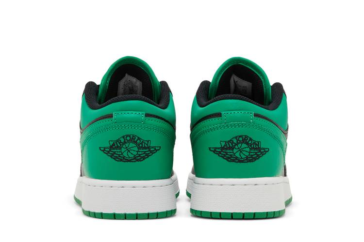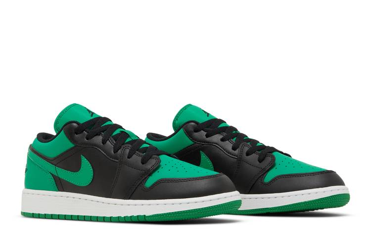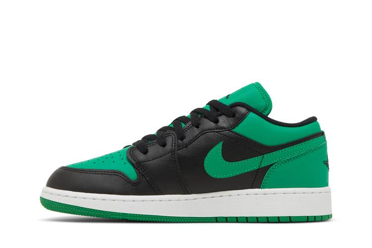 The Jordan 1 Low Lucky Green (GS) features a leather upper with a black base and green accents on the Swoosh, heel overlay, toebox, and collar. It includes a Wings...