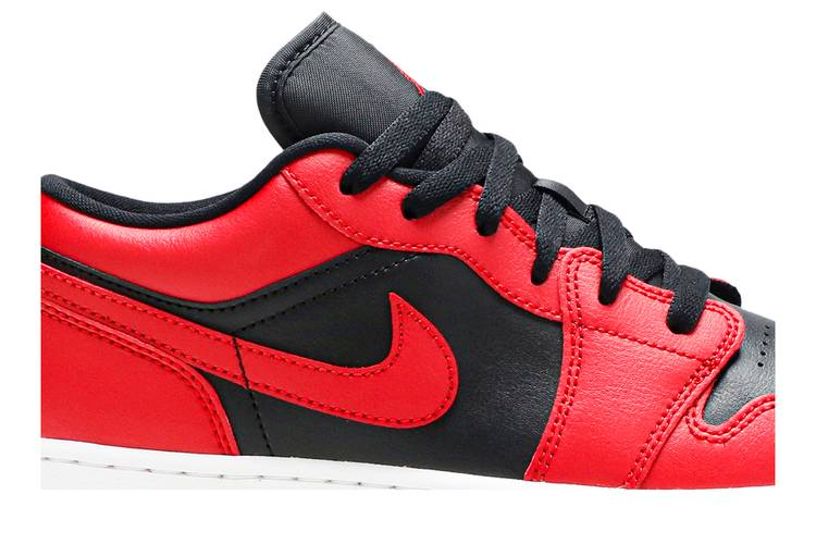 The Air Jordan 1 Low Reverse Bred for Grade Schoolers (GS) features a black upper with red overlays, a red Swoosh logo, and black embroidered Jumpman and Wings. The shoe...