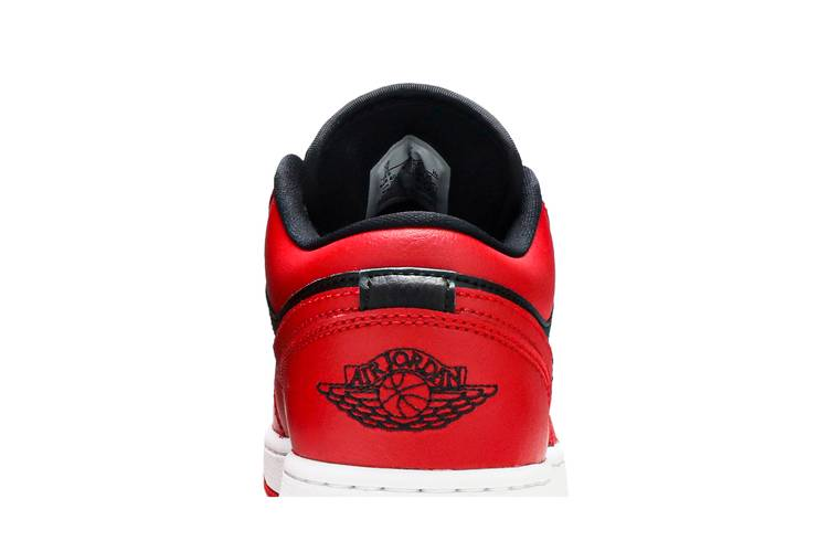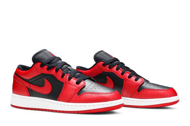 The Air Jordan 1 Low Reverse Bred for Grade Schoolers (GS) features a black upper with red overlays, a red Swoosh logo, and black embroidered Jumpman and Wings. The shoe has a white rubber midsole and red outsole for traction. Released in July 2020.