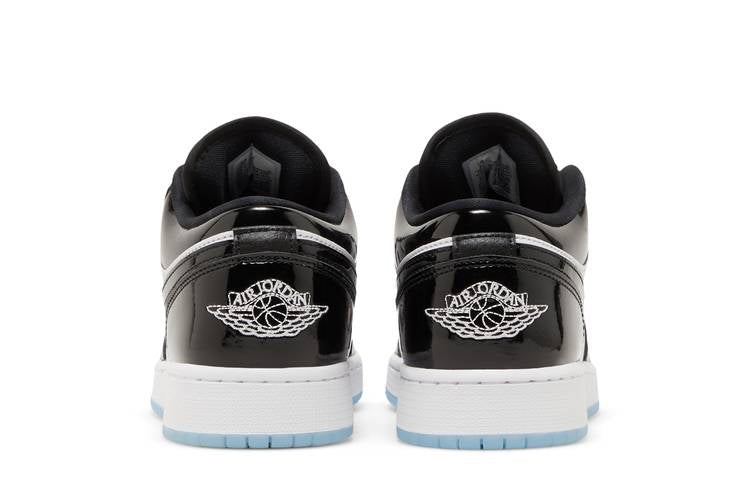 The Air Jordan 1 Low SE Concord (GS) is a white and black sneaker with a leather upper and Jumpman emblem on the tongue. Featuring a lightweight midsole, rubber outsole, padded collar, and perforations for ankle support and ventilation, this shoe also includes a Nike Swoosh on the sides and Air Jordan logo on the heel.