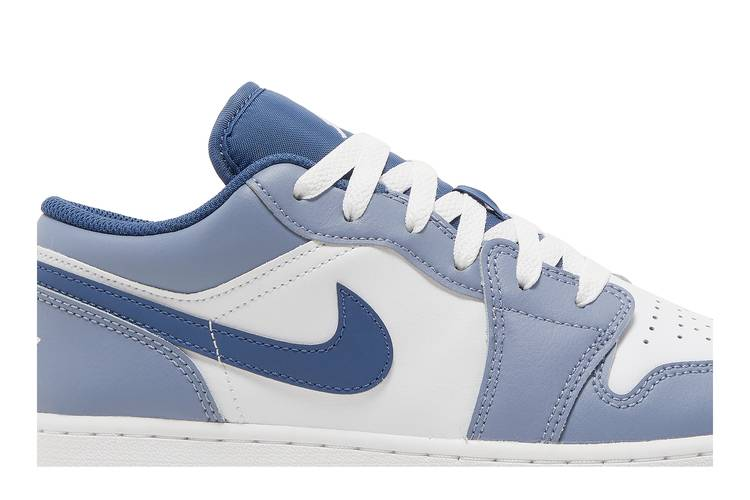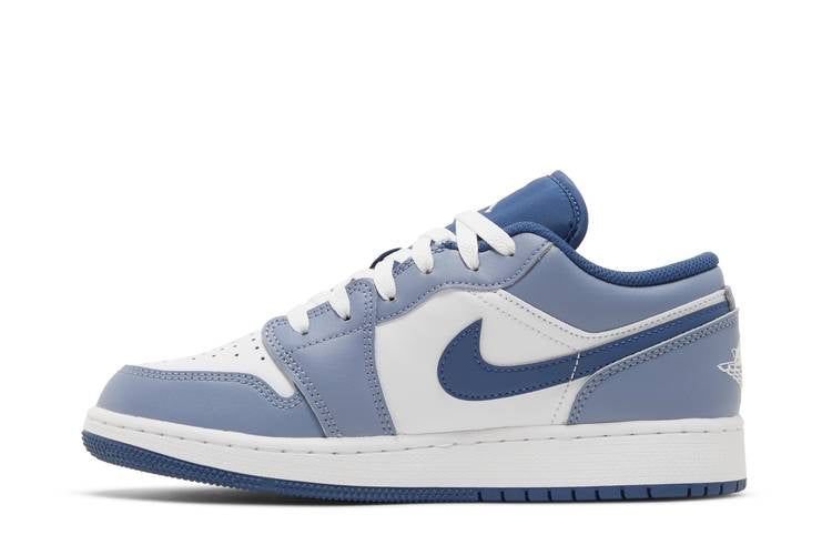The Jordan 1 Low Slate Blue Navy (GS) is a grade school-sized shoe featuring a white leather base with Slate Blue and navy accents. The sneaker includes leather overlays, a...
