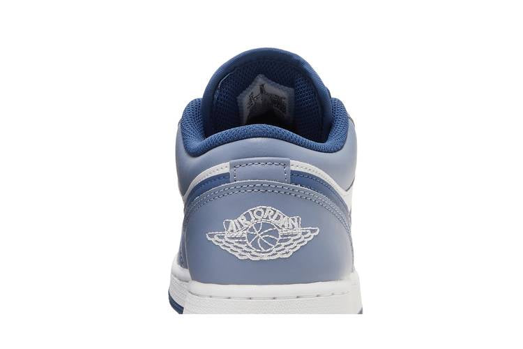 The Jordan 1 Low Slate Blue Navy (GS) is a grade school-sized shoe featuring a white leather base with Slate Blue and navy accents. The sneaker includes leather overlays, a navy Swoosh, and a nylon tongue with an embroidered Jumpman. The insole showcases a Jumpman logo, while the heel boasts a Wings logo. The shoe is completed with a white foam midsole and navy rubber outsole with Jordan branding.