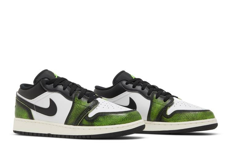 The Jordan 1 Low Wear Away Electric Green (GS) features a Black/Electric Green/White colorway with a unique design that reveals an Electric Green hue underneath the black heel and mudguard with wear. Crafted from a fusion of leather materials, this sneaker promises both style and durability. The iconic Jordan Wings Logo on the heel pays homage to its basketball origins while staying on-trend with today's fashion. Launching on July 26, 2022, this sneaker is a must-have for any Jordan enthusiast.