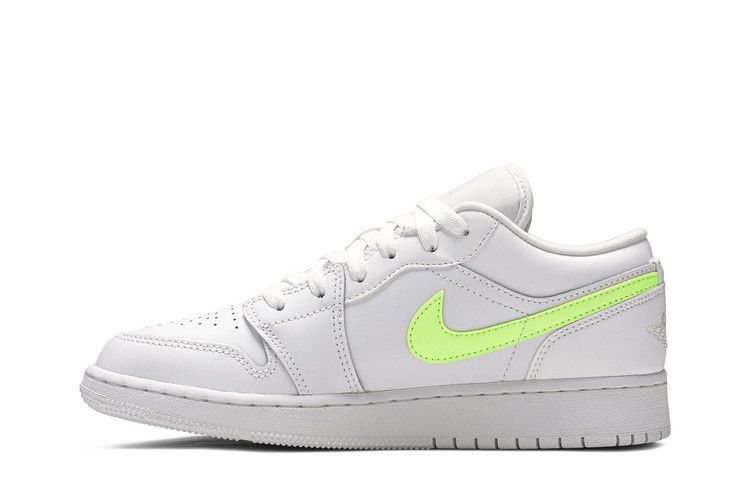 The Air Jordan 1 Low White Neon GS has a low-cut silhouette inspired by the original Air Jordan 1 basketball shoe, designed for grade school children.