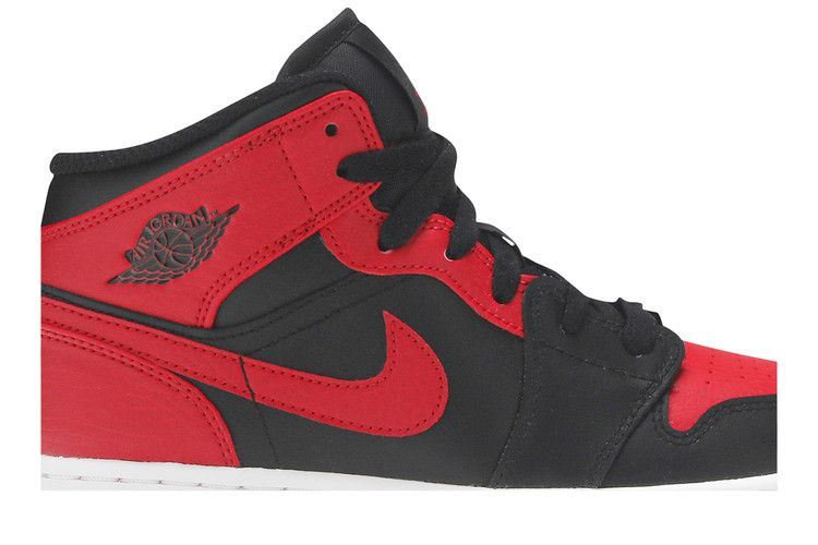 The Kids Air Jordan 1 Mid Banned (2020) (GS) features red leather on the ankle flaps, Swoosh, heel counters, and toe boxes. Black laces, leather medial side and toe panels,...