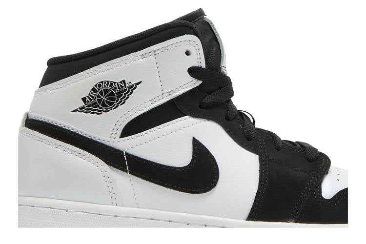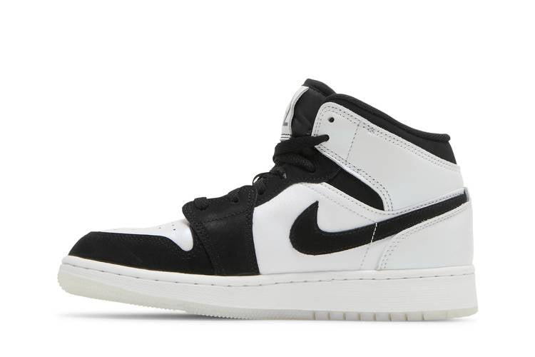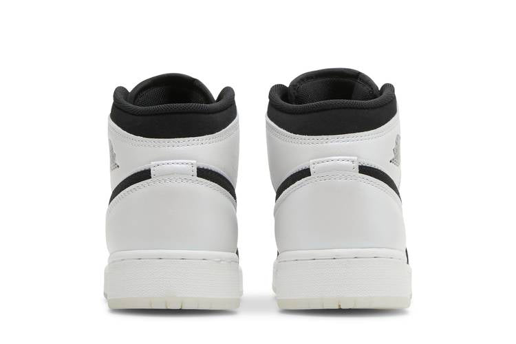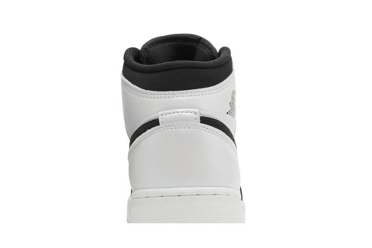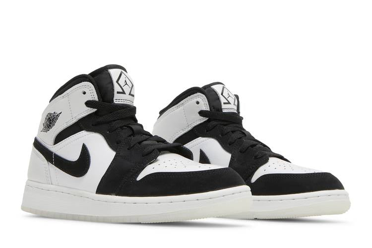 The Air Jordan 1 Mid Diamond Shorts (GS) is a stylish and classic sneaker designed for big kids. Featuring a white leather upper with black suede accents, this mid-top shoe celebrates the NBA's 75th anniversary with a neutral two-tone color scheme. The shoe includes a Jumpman icon on the tongue tag framed in a geometric shape, paying homage to the NBA's diamond anniversary. With an encapsulated Air-sole unit in the heel and a semi-translucent rubber outsole, these sneakers offer both comfort and style for young basketball enthusiasts.