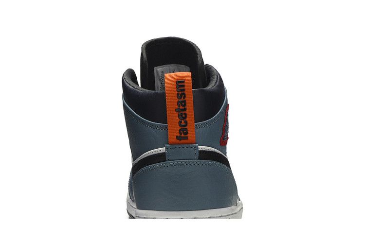The Jordan 1 Mid SE Facetasm features a white leather upper with light blue and navy overlays, designed in collaboration with Japanese brand Facetasm. It showcases a crinkled texture, orange...