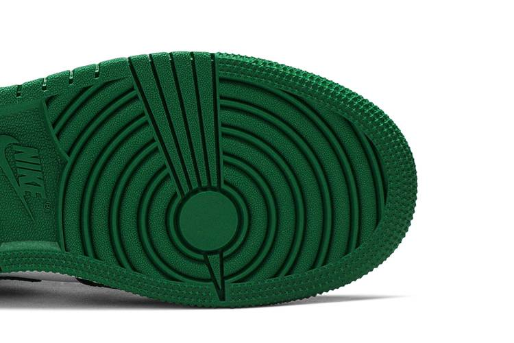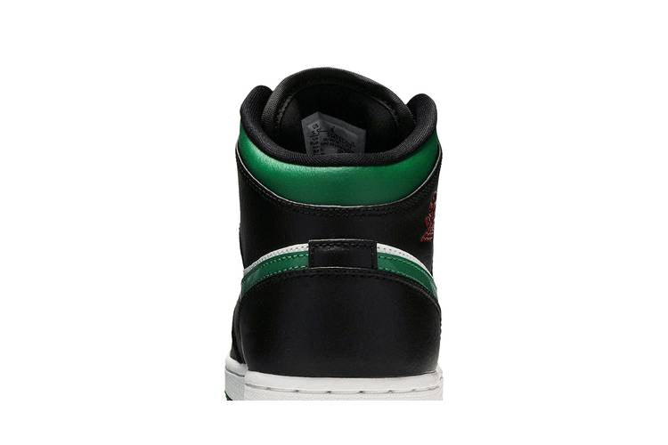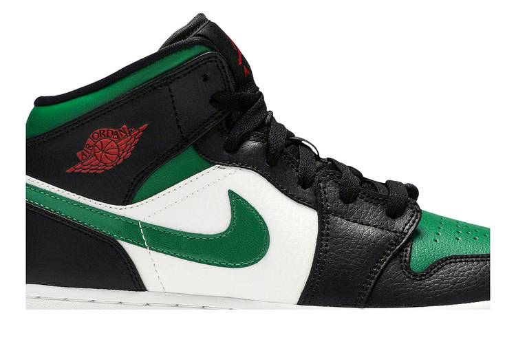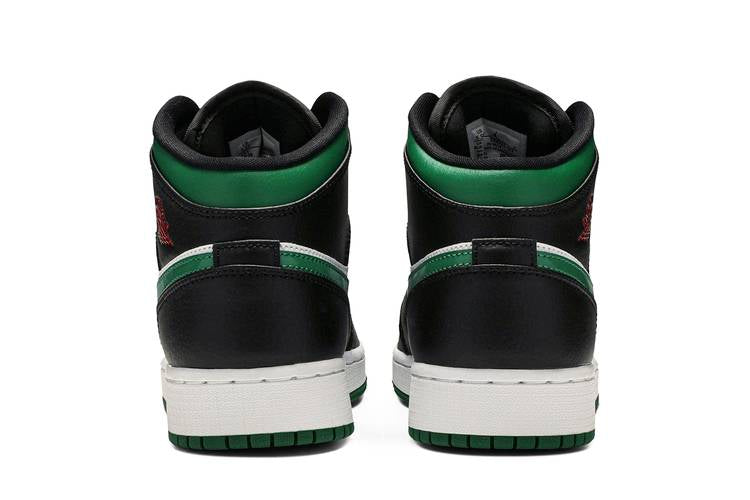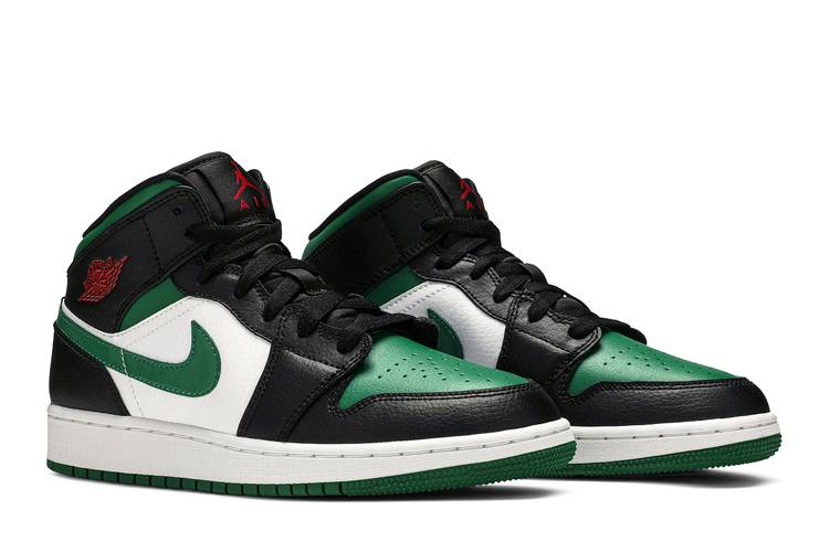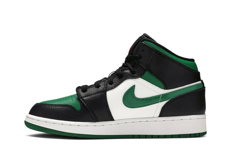 The kids Jordan 1 Mid Green Toe (GS) showcases a leather upper in white, black, and green hues, accented by red Air Jordan Wings logos on the collar. A coordinating sole and Jumpman woven tongue label complete the design. Released in December 2019, this model offers a stylish and iconic look for young sneaker enthusiasts.